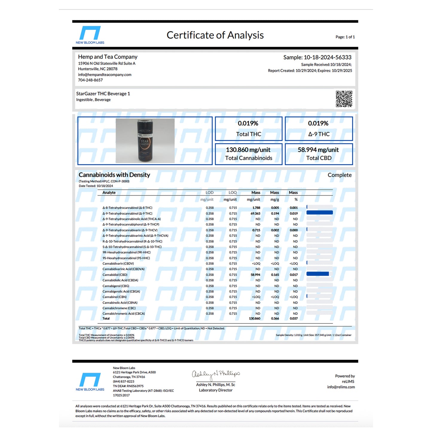 Hemp & Tea | Stargazer Sparkling Delta 9 THC + CBD Drink Infusion - Citrus Haze - 75mg - 16 fl oz