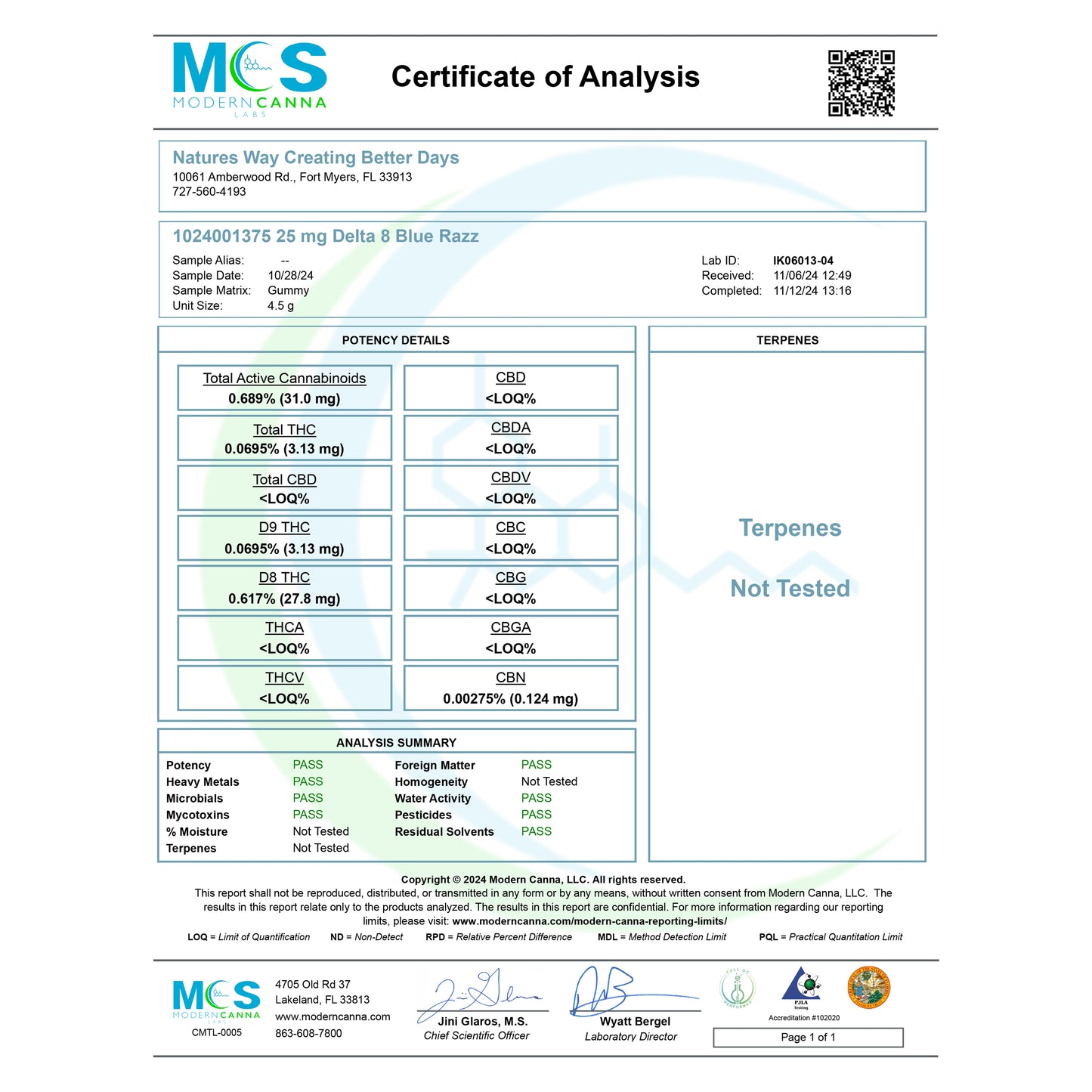 Each gummy is infused with 25mg of pure Delta 8 THC.